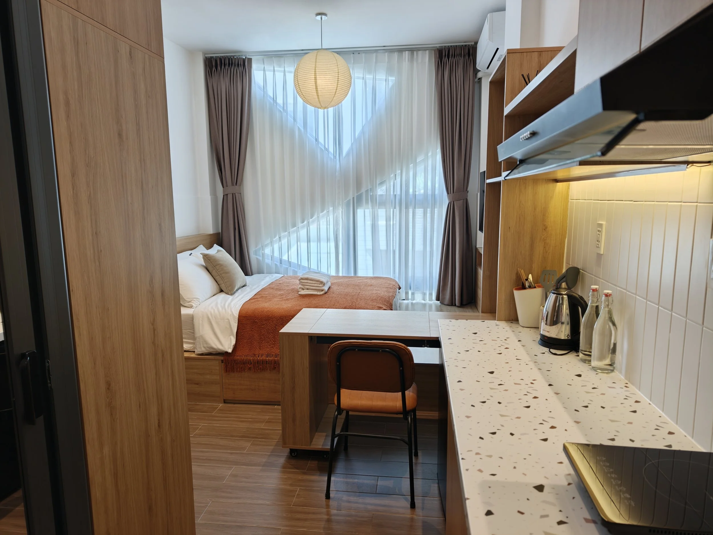 Hygge Studio: 20sqm studio featuring a queen bed (160×200cm) with a dedicated workspace, private bathroom, fully-equipped kitchen, and fridge.